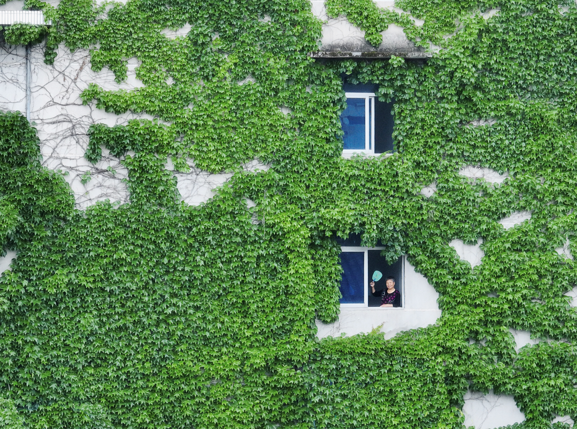 浮云街道一市民家墙面上满墙的爬山虎绿意盎然